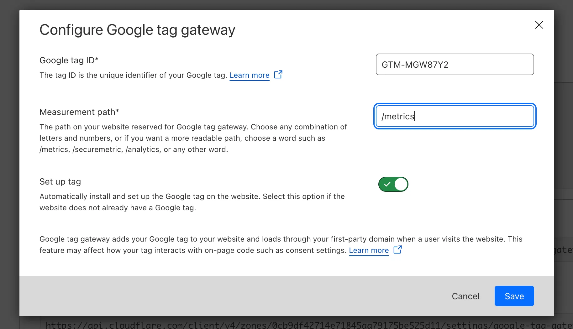 - Add your Google tag ID and the path on your website reserved for the Google tag. The Google tag ID ↗ can be found in the Google Tag Experience dashboard. The measurement path is an unused path on your site that will load Google Tag Manager and all subsequent measurement requests.