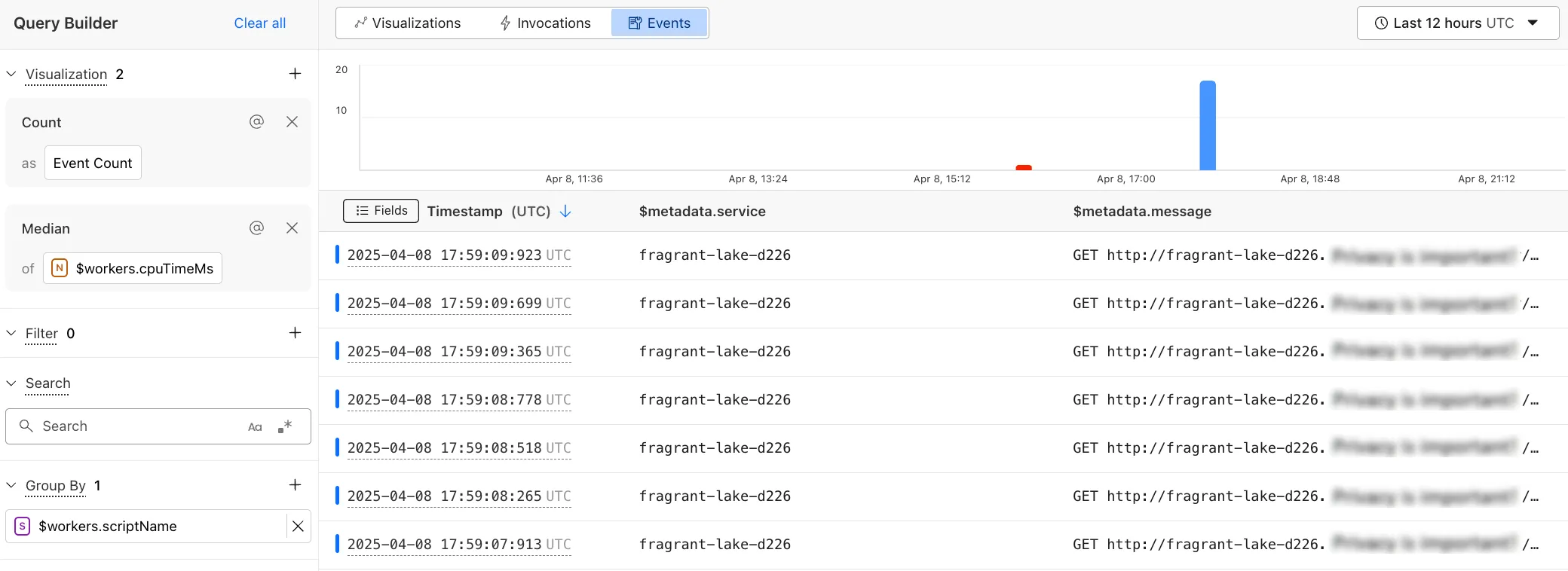Then, we group by $workers.event.request.path and $workers.event.response.status to identify the number of requests that were